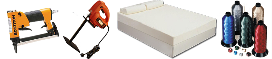 Pillow forms, Dacron polyester batting, Welt cord, Zippers, Webbing, Staples, Dust cover(Cambric), Deck denim material, Burlap, Polyester fill, Padding, Threads & bobbins, Staple Guns, Fasteners, Adhesives, Silicone, Button supplies, Upholstery tools, etc..
